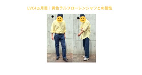 LVCジーンズ4カ月目の濃紺と、ラルフローレンの黄色シャツを合わせたレビュー。90年代BIG SHIRTのサイズ感や色合わせ、中年でも自然に着こなせる“質感ある黄色”の楽しみ方を紹介します。